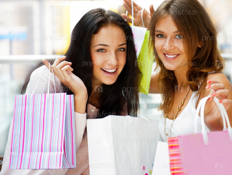 Две девушки с покупками в торговом центре