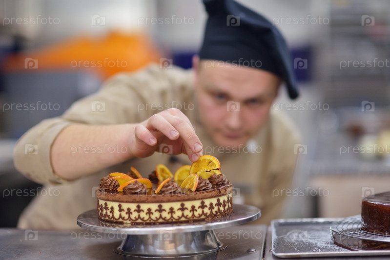 Шеф-повар готовит торт на кухне