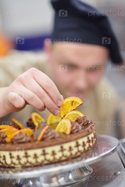 Шеф-повар готовит торт на кухне