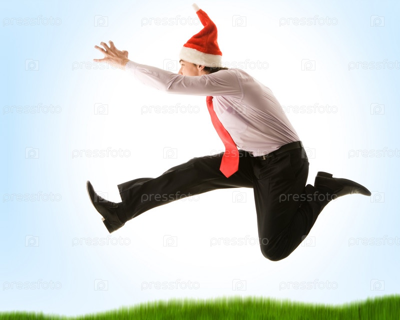 Очень радостный бизнесмен прыгает высоко, вытягивая руку вперед
