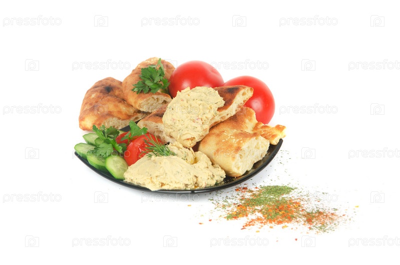Куски пирога и свежие овощи в тарелке, белый фон