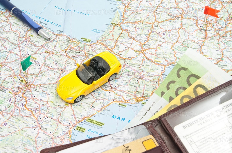 Автомобиль, деньги и ручка на карте
