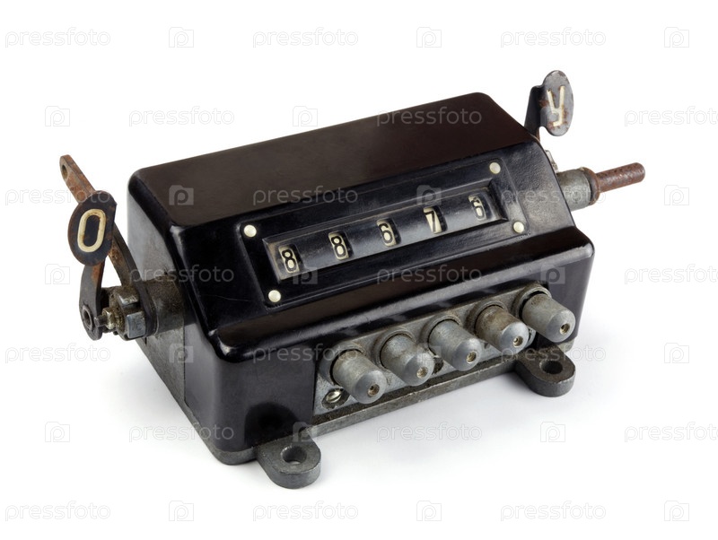 Старый прибор - машинка для сложения и вычитания, белый фон