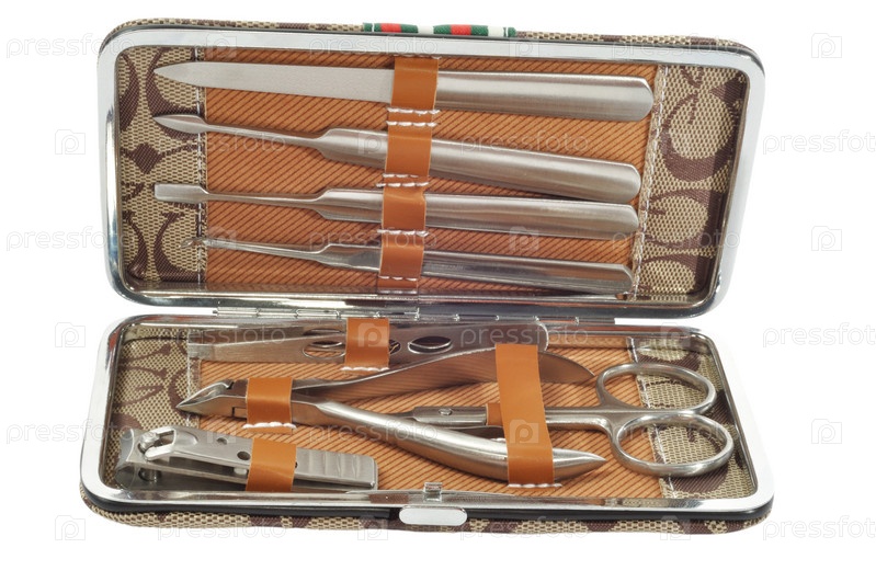 Набор стальных маникюрных инструментов, изолирован на белом фоне