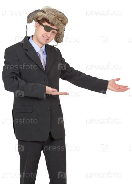 Одноглазый мужчина в русской меховой шляпе указывает на гостеприимные руки