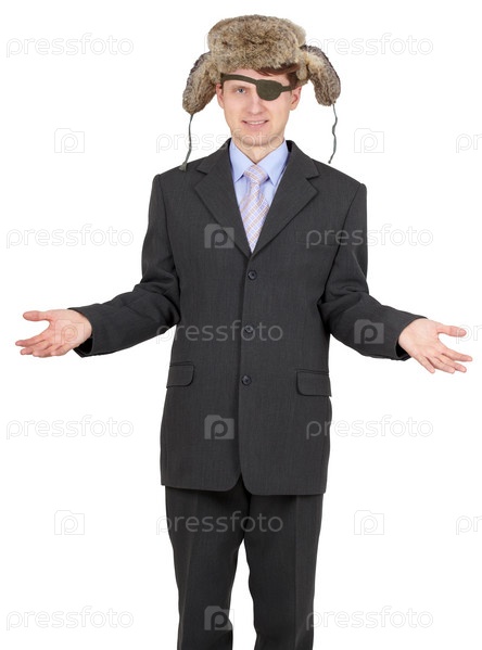 Одноглазый мужчина в русской меховой шляпе указывает на гостеприимные руки