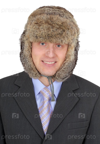 Портрет русского бизнесмена в меховой шляпе, изолированный на белом фоне