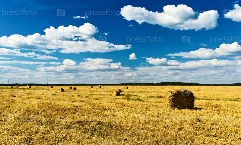 Пшеничные стога на скошенном поле, солнечный осенний день