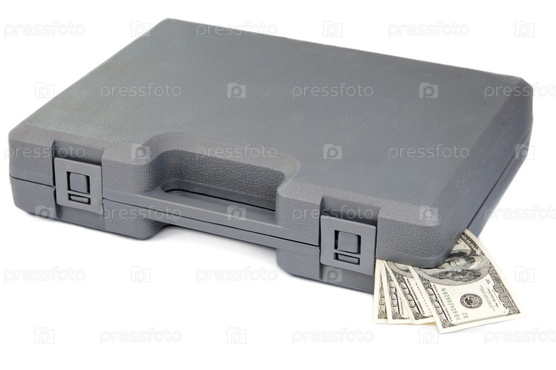 Серый кейс с долларами на белом фоне. Крупный план
