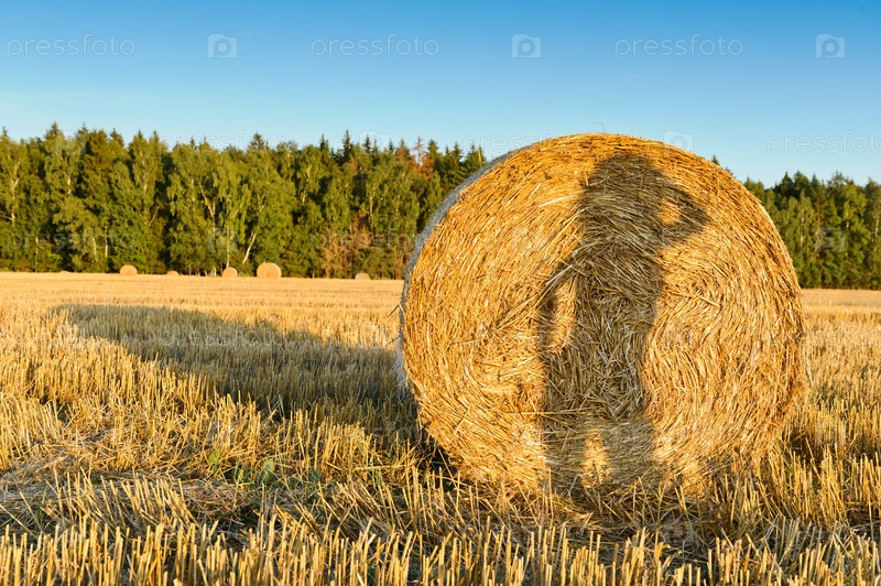 Тень девушки на стоге сена, солнечный осенний день