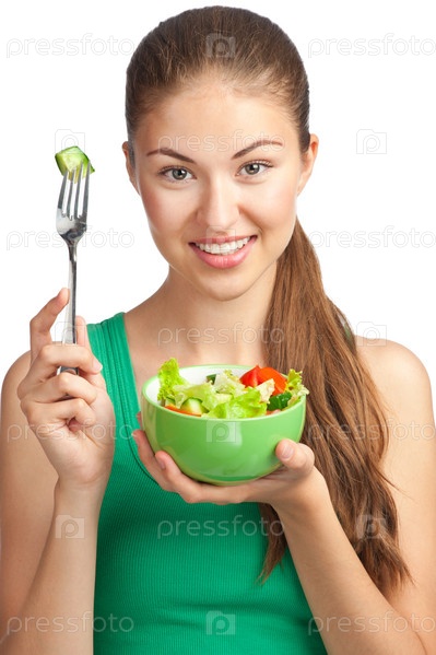 Девушка улыбается и держит в руках миску с овощным салатом. Белый фон, крупный план