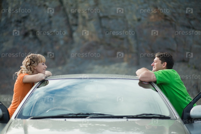 Счастливые мужчина и женщина возле автомобиля во время путешествия