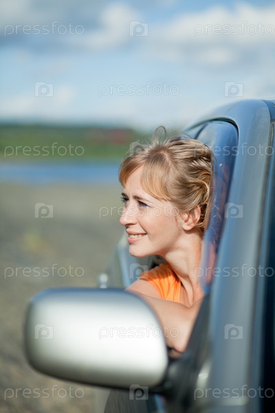 Радостная женщина выглядывает из окна автомобиля