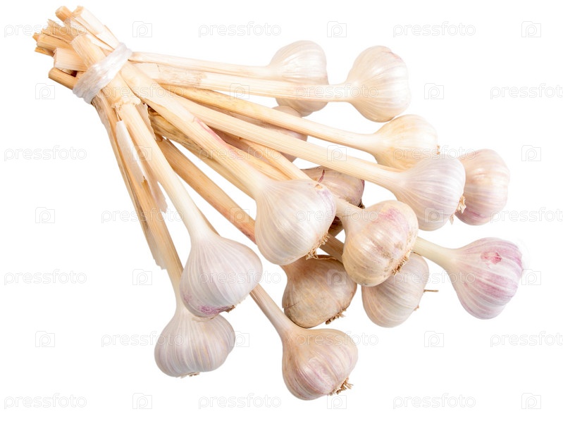 Пучек белого чеснока. Изолированный на белом фоне. Крупный план, студийная съемка