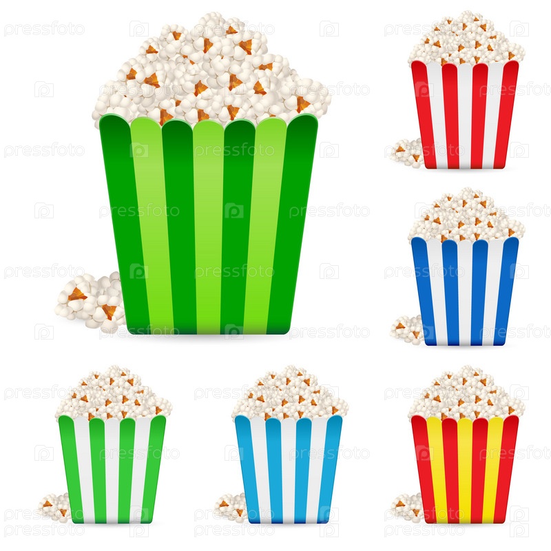 Коллекция полосатых стаканов с попкорном на белом фоне