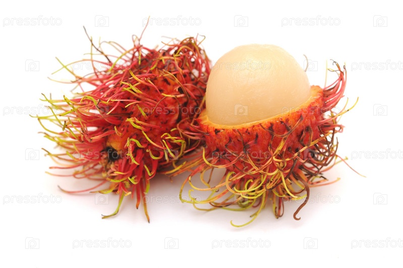 Два рамбутана, у одного наполовину снята кожура. Крупный план, белый фон