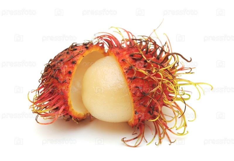 Очищенный наполовину рамбутан. Крупный план, белый фон