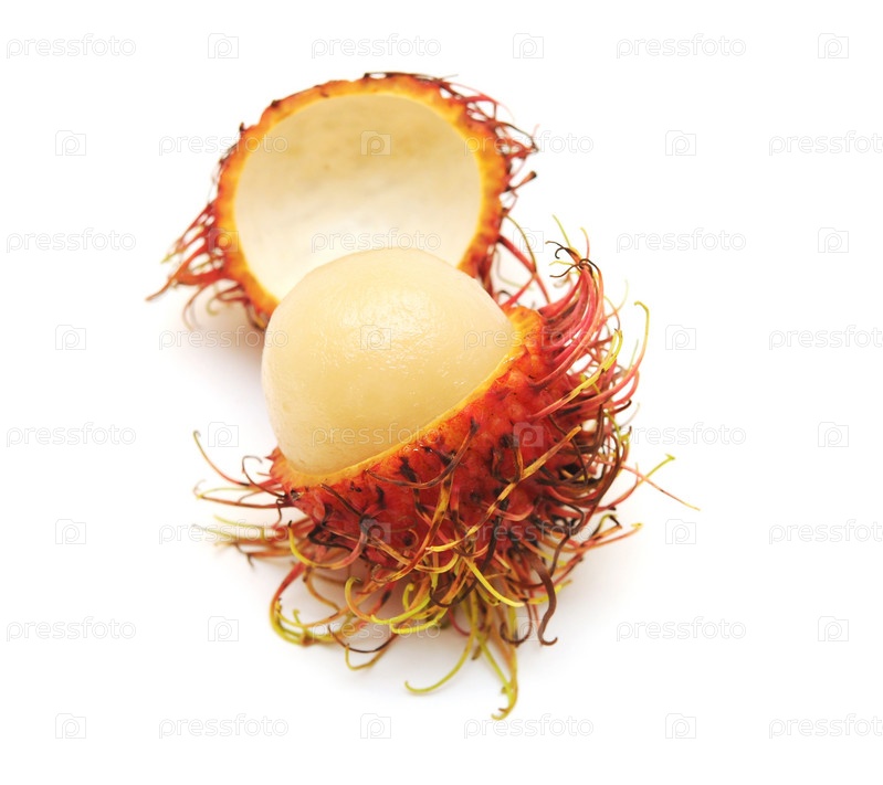 Очищенный наполовину рамбутан. Крупный план, белый фон