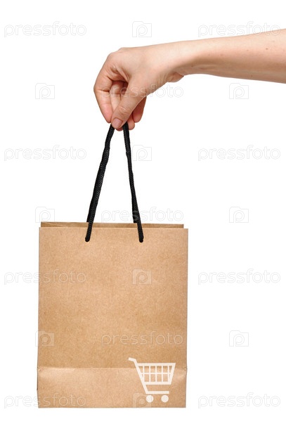 Рука держит бумажный пакет на белом фоне. Крупный план