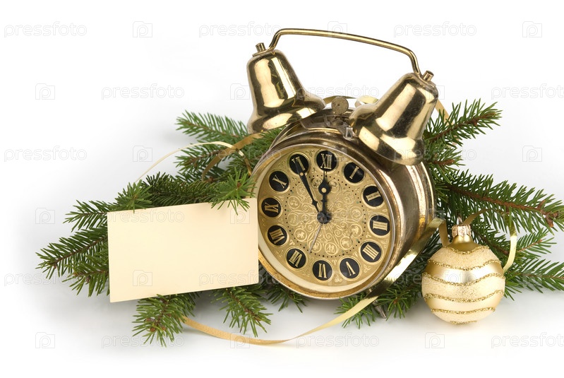 Новогоднее украшение с антикварными часами и ветвями фиртовых деревьев, а также пустой карточкой для вашего текста