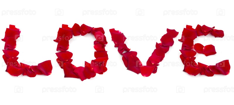 Слово 'Love' из листьев роз на белом фоне