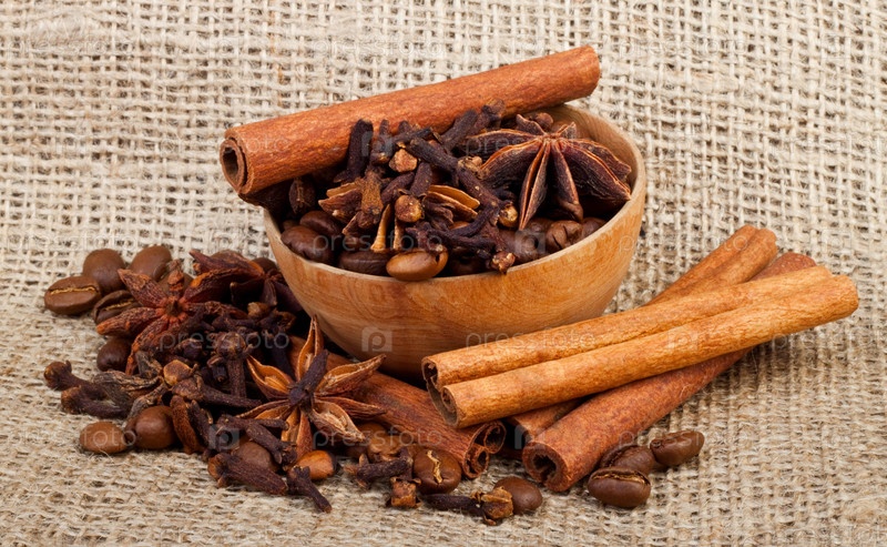 Корица, анис, гвоздика и кофейные зерна на фоне ткани