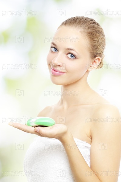Красивая девушка с мылом в руке на светлом фоне