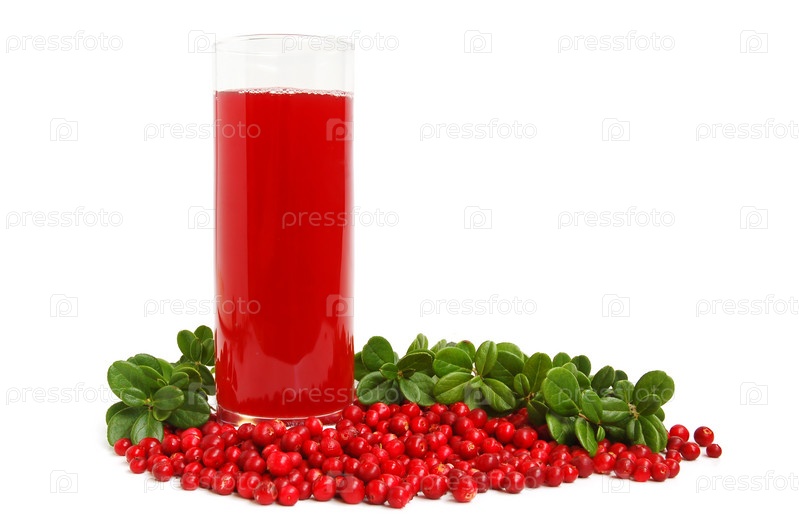 Стекло с свежефруктовым напитком из клюквы и листьев на белом фоне