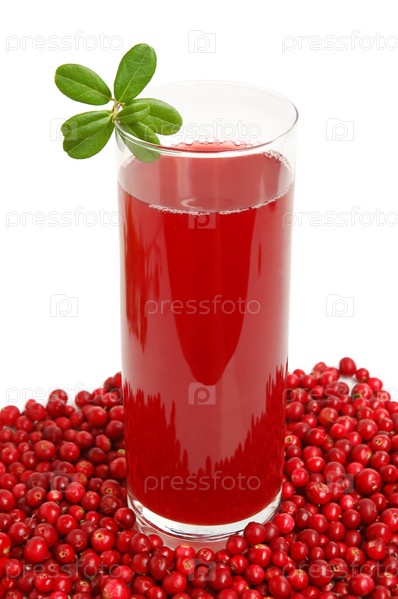 Стекло с свежефруктовым напитком из клюквы и листьев на белом фоне