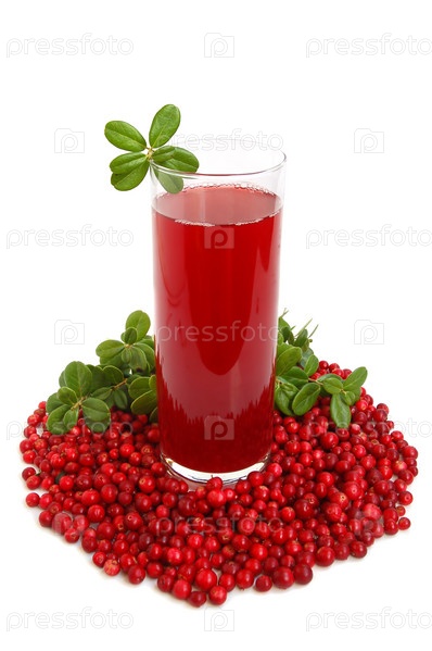 Стекло с свежефруктовым напитком из клюквы и листьев на белом фоне