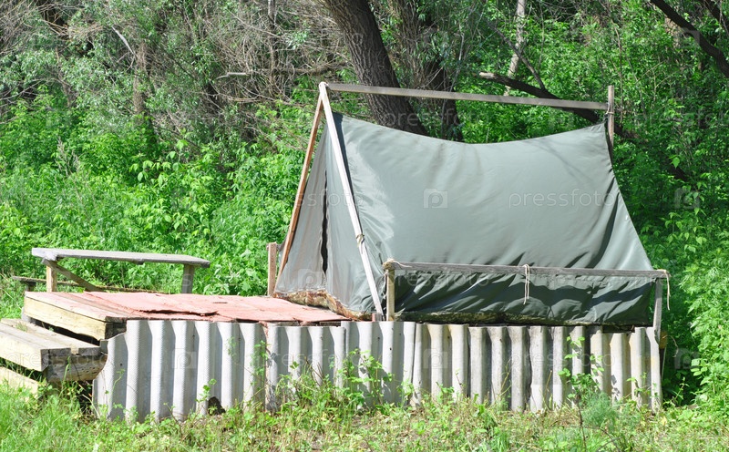 Серая палатка с крылечком в лесу