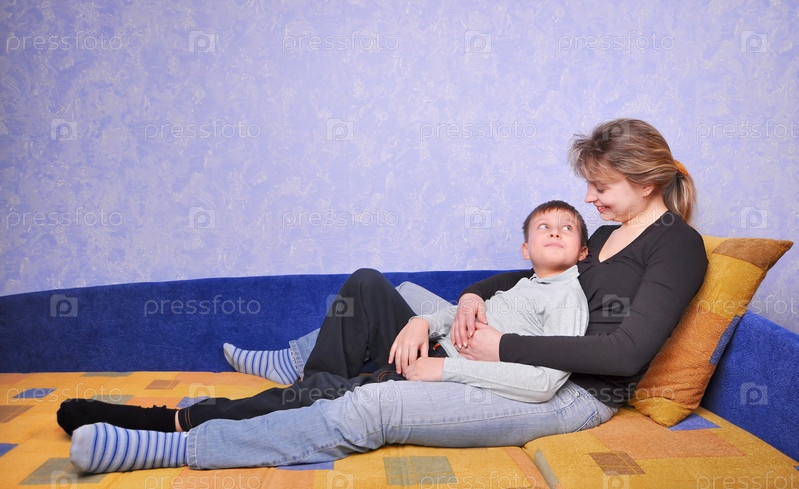 Улыбающаяся женщина и мальчик-подросток сидят на диване дома
