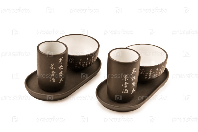 Керамические кружки в блюдцах на белом фоне