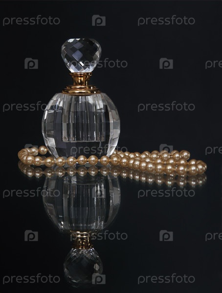 Старомодные духи и нитка жемчуга на черном фоне