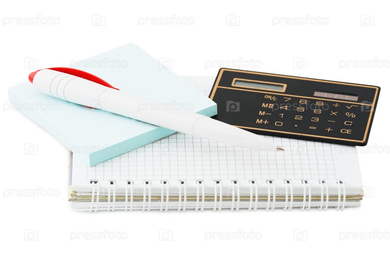Ручка, блокнот, стикеры и калькулятор на белом фоне