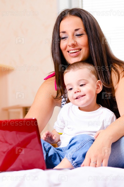 Мать и маленький сын сидят перед ноутбуком на кровати