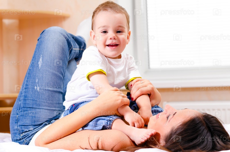 Мать с сыном играют на кровати