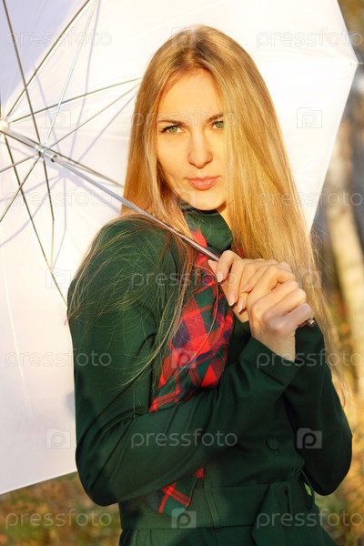 Молодая блондинка с белым зонтиком в осеннем парке