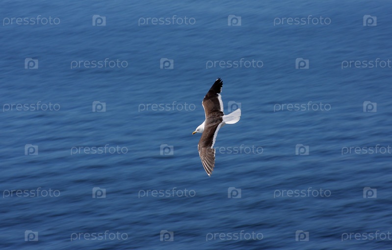 Чайка парит над синим морем