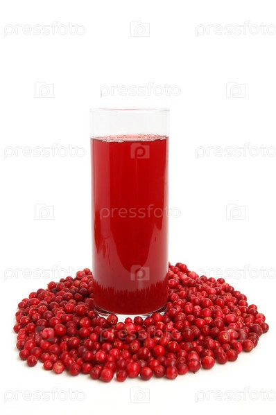 Стекло с свежефруктовым напитком из клюквы и листьев на белом фоне