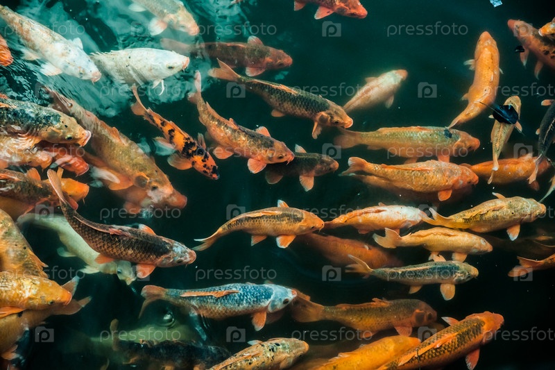 Множество разноцветных рыб кои