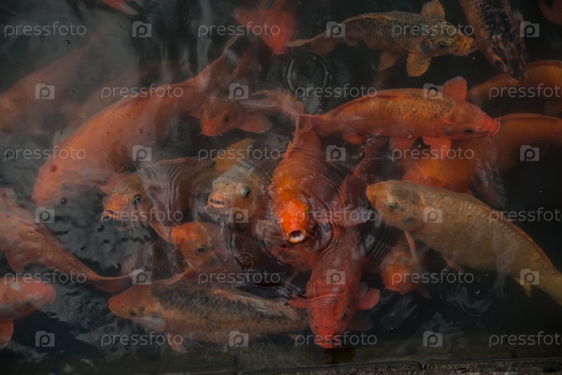 Множество разноцветных рыб кои