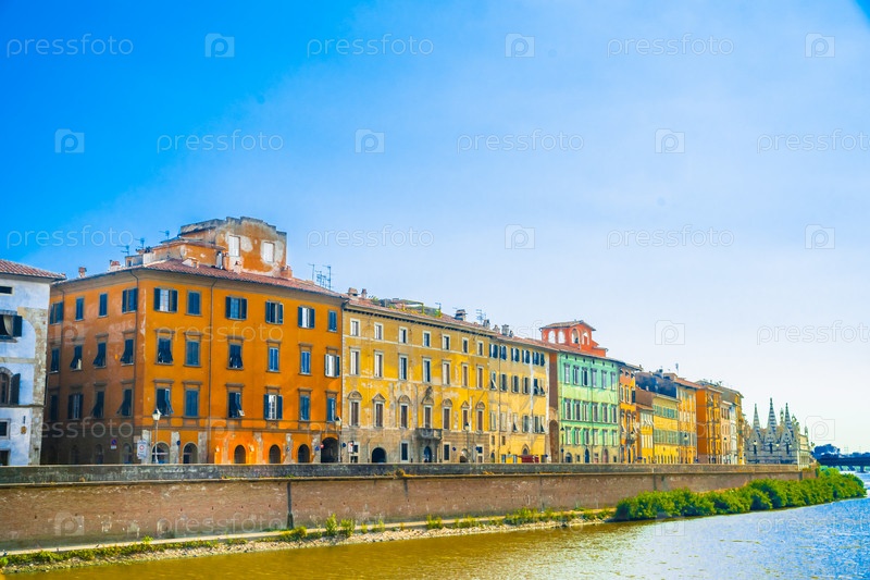 Вид старой улицы и реки Арно в городе Пиза, Италия
