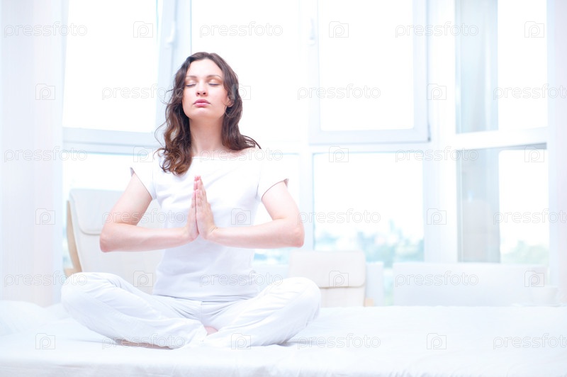 Молодая женщина медитирует на кровати