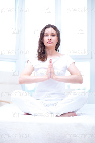 Молодая женщина медитирует на кровати