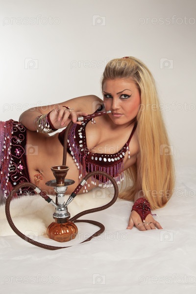 Женщина в арабском костюме курит кальян