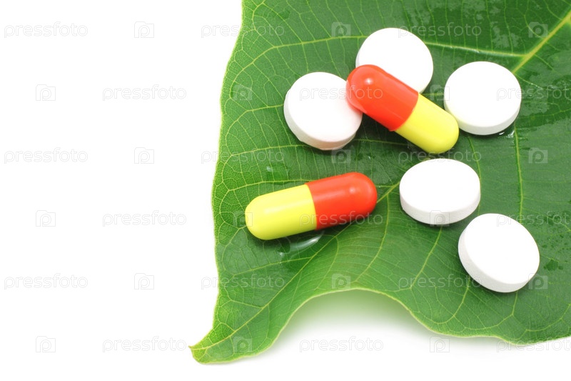 Красно-желтые пилюли и белые таблетки на зеленом листе. Крупный план