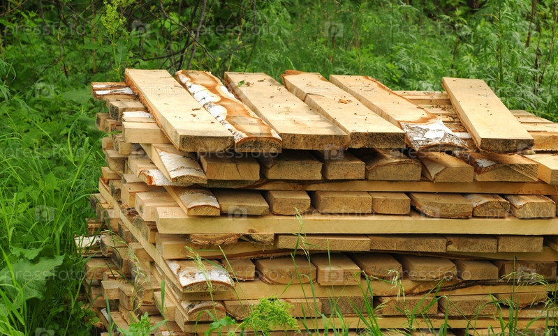 Доски аккуратно сложенные друг на друга в траве. Крупный план