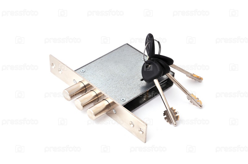 Металлический дверной замок с ключами на белом фоне