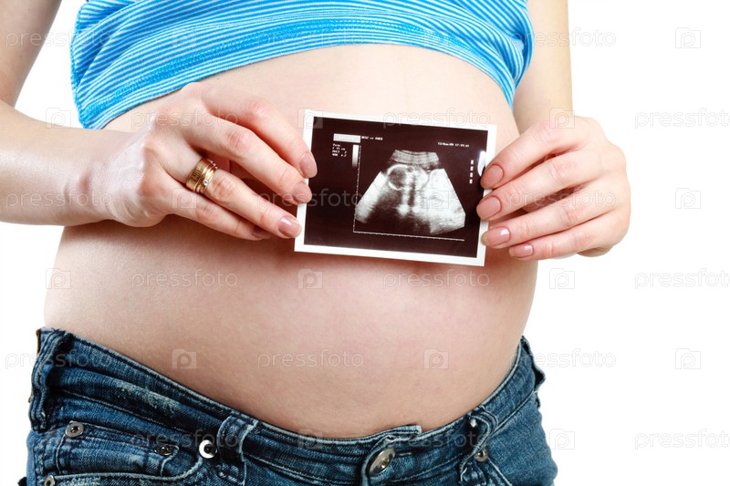 Беременная женщина держит снимок УЗИ на фоне своего живота